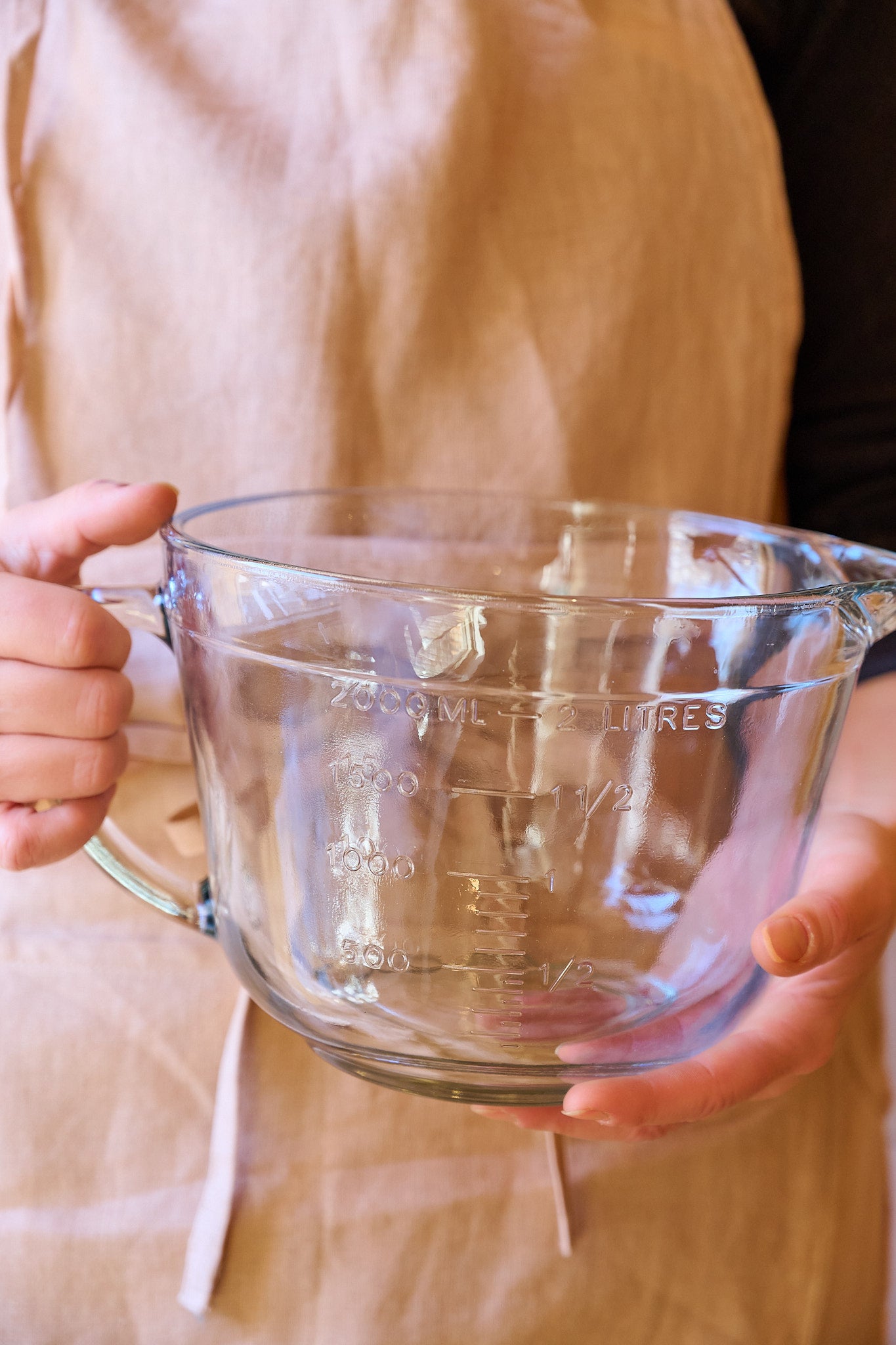 Sturdy, clear glass batter bowl features embossed measurements, a convenient handle, & an easy pour spout.